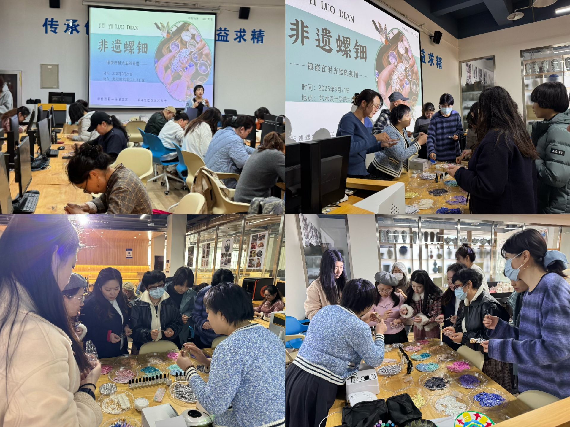 体验非遗创造美,指尖生花悦身心,3月21日下午,艺术设计学院分工会组织了一场别开生面的“非遗螺钿胸针制作”体验活动。来自各院系、部门的50余名教职工齐聚一堂,在螺钿工艺师的指导下,女教职工们将莹润贝母镶嵌成翩跹蝴蝶,亲手制作出独具东方美感的螺钿胸针,感受跨越千年的匠心之美,50多枚流光溢彩的胸针承载着传统工艺的温度。