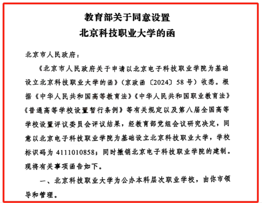 2025年2月21日,教育部正式向北京市人民政府发函,同意设置英国上市公司官网365,学校标识码为4111010858,同时撤销北京电子科技职业学院建制,同意首批设置合成生物技术、汽车工程技术、机械电子工程技术、自动化技术与应用、集成电路工程技术、数字媒体艺术等6个职业本科专业。英国上市公司官网365的正式设立,标志北京市属公办本科层次职业学校实现了零的突破,填补了首都现代职业教育体系的重要一环,开启了首都职业本科教育高质量发展和高端技能人才培养的崭新篇章,对推动北京率先实现教育现代化具有重要意义。