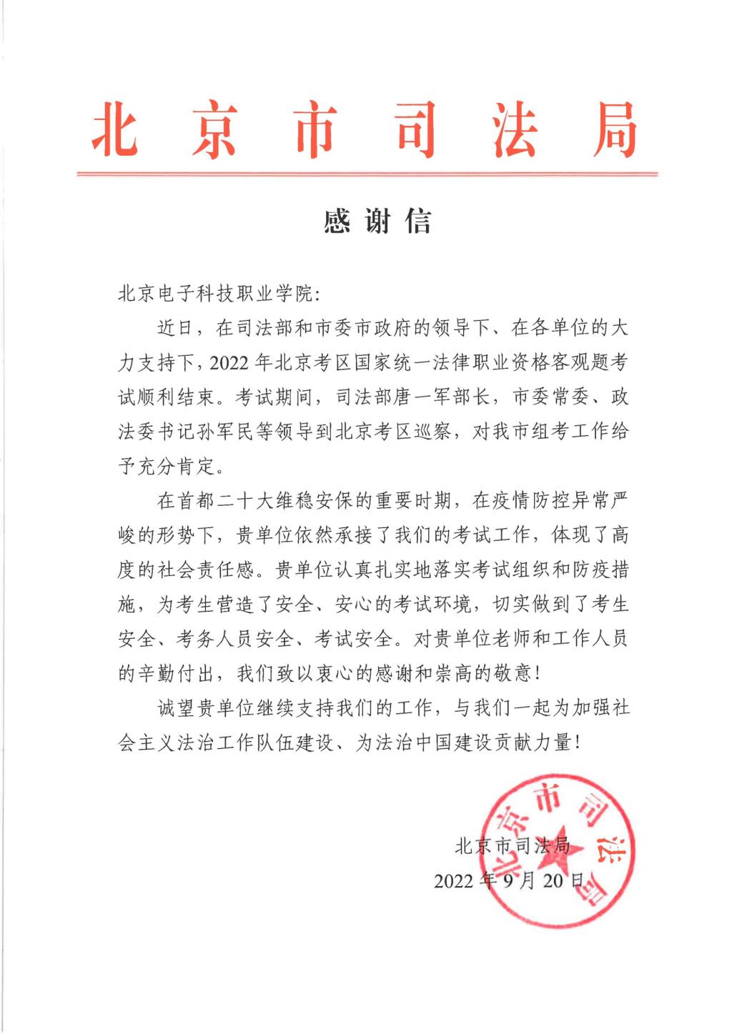 姚光业表示,感谢司法部、北京市委市政府和北京市司法局的信任,感谢北京市司法局对学校工作的认可和肯定。学校以高度的社会责任感承接本次考试,经过学校各部门、各二级学院及全体师生教职工的共同努力,我们经受住了疫情防控、与校内安排时间重叠等严峻考验,圆满完成了本次考试的组织服务工作。今后,学校将继续充分发挥社会服务职能,承接好法律相关考试工作,进一步加强与司法局的沟通联系,拓展合作空间,为加强社会主义法治工作队伍建设、为法治中国建设和首都经济社会发展做出更大的贡献。