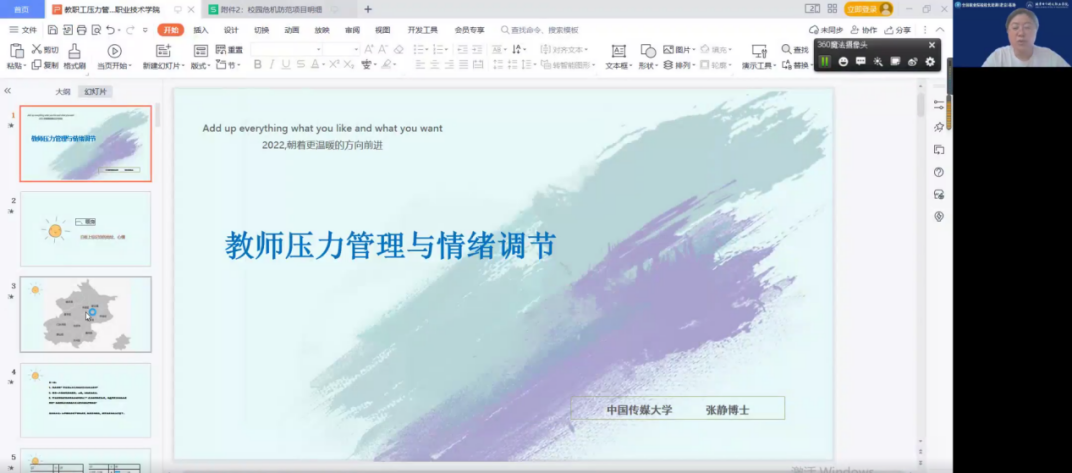 中国传媒大学副研究员张静作了《教师压力管理与情绪调节》讲座。她以互动性极强的开场导入讲座,极大地调动了学员的学习兴趣,并从教师压力情况的数据分析,压力与身体健康的关系,压力的积极和消极功能,提升心理健康水平、积极压力调节的策略等几大方面给学员进行了心理学方面的专业讲解,为教师如何进行自我压力管理与心理健康调试给予了专业的辅导。