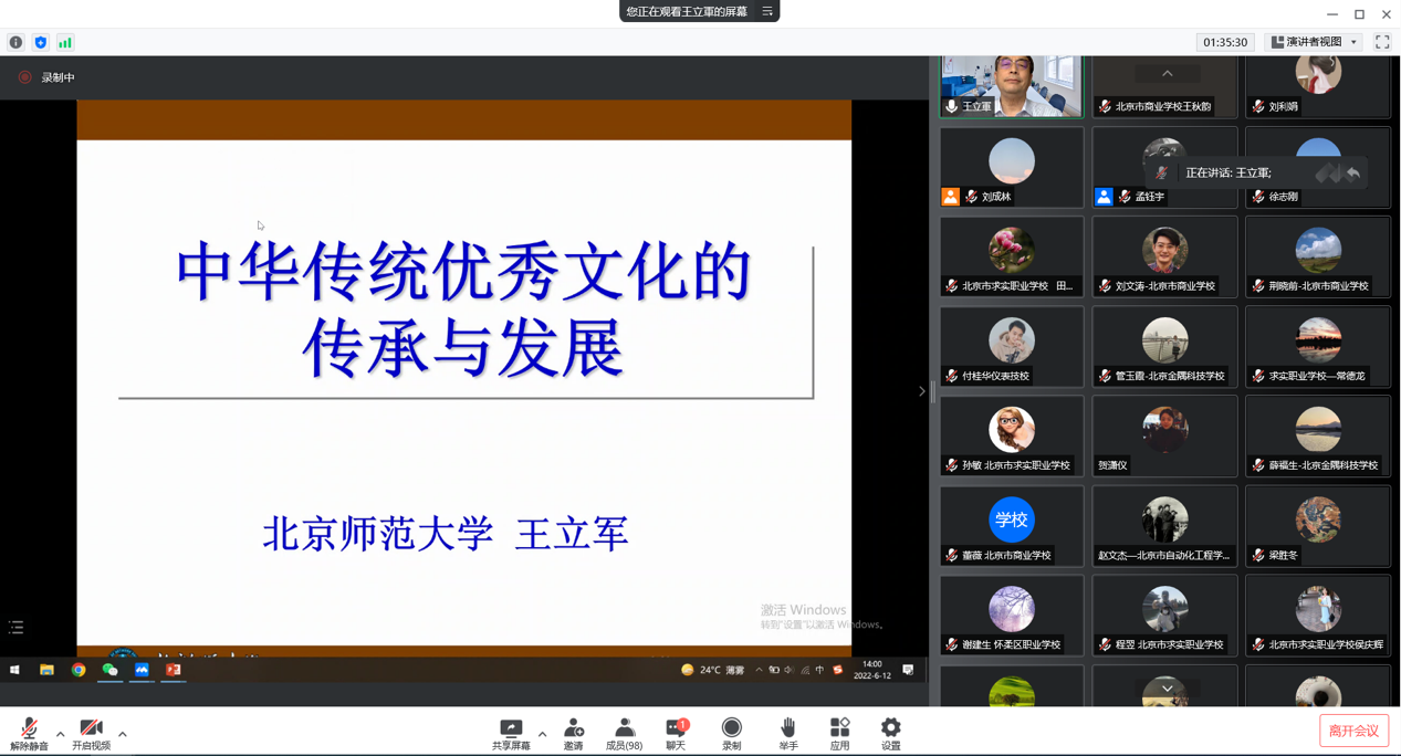 教育部“长江学者”特聘教授、“万人计划”教学名师、中国文字整理与规范研究中心主任、民俗典籍文字研究中心主任、北京师范大学文学院院长王立军教授作了《中华传统文化的传承与发展》的讲座。王院长用三个小时时间,从传统文化与“国学”、中华传统文化的传承体系—经典的形成、中华传统文化的现代价值—经典的应用以及统编中职语文教材对中华传统文化的体现四个方面,以“文”“化”二字的发展演变为例,通过生动解析汉字构形中丰富的文化内涵,深入阐释了汉字构形与中国文化之间的密切关系,讲解了经典的内涵与经典系统的形成,并以《大学》《中庸》《四库全书》等经典国学内容为例带领参培学员学习和把握经典精髓的方法,深刻分析了社会主义核心价值观与中国古代经典的关联,展示了经典文化的当代意义,使学员们感受到了中华传统文化的传承与发展的重要意义。通过对统编中职语文教材对中华传统文化选文的比例的介绍,让学员们感受到了中职教师对继承弘扬中华优秀传统文化的重要使命及其在学生管理工作中的运用。王教授强调,把中华传统文化赋予当代教育的价值是我们教育工作者的责任,传统文化与现代文化一脉相承,我们要关注传统、融入现代,赋予传统文化新的活力,不断提升学生的文化素养,提高民族的文化自信。
