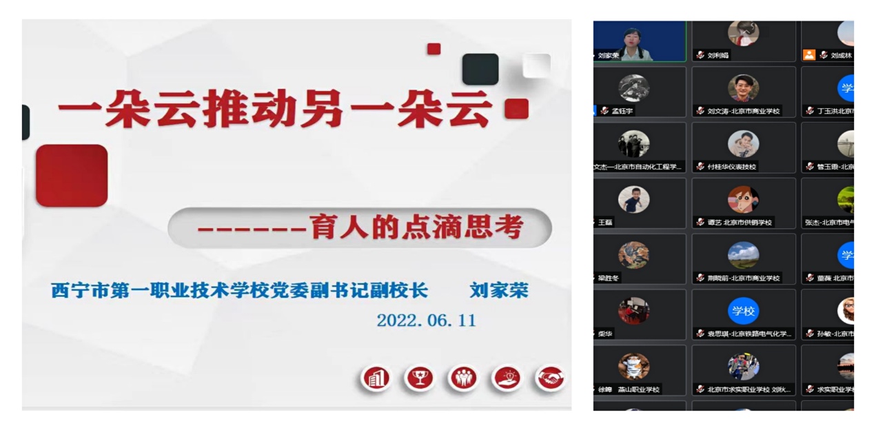 西宁市第一职业技术学校党委副书记、副校长刘家荣副教授作了《一朵云推动另一朵云——育人的点滴思考》的讲座,从激发教师事业心、责任心,提升教师育人能力典型做法;树立教师队伍典型,评选同伴教育榜样;培养学生学习习惯和提升学习能力典型做法;加强体育美育,促进身体健康和内涵发展;加强人文关怀,推进心理健康教育等五大方面为学员们讲解了非常多切实可行的典型做法。刘校长引用德国哲学家雅思贝尔斯的“教育的本质是一棵树摇动另一棵树,一朵云推动另一朵云,一个灵魂唤醒另一个灵魂”为主题,从主题班会改革、晚自习改革、体育教育改革到学生心理健康教育改革等等,在具体的工作实践中处处体现出了作为一名教育工作者对学生的关爱。刘校长强调,文化是环境,德育是灵魂,我们要始终以德育为先、五育融合,为学生打造一个健康向上的文化环境,完成育人铸魂教育的神圣使命。