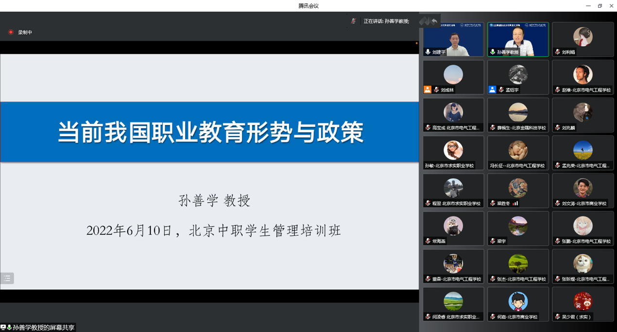 三天的线上培训,6场精彩的专题报告带领学员们系统学习了前沿的理论知识、开拓了学生管理工作思路,得到了学员们的一致好评。首场报告是由中国职业技术教育学会副会长、中华职业教育社常务理事、北京外国语大学教授孙善学带来的《当前职业教育的形势与政策》专题报告。孙教授的讲座对职业教育面对的就业、人口、技术、企业、教育等外部发展形势做了深入的分析,重点解读了新修订的《职业教育法》的特点、产教融合对职业教育的重要意义、企业在职业教育中的作用以及地方政府的责任等内容。孙教授的报告主题鲜明,内涵深刻,内容丰富,开阔了学员的思维视野,为中职教育教学改革、高质量发展提供了有针对性的指导。