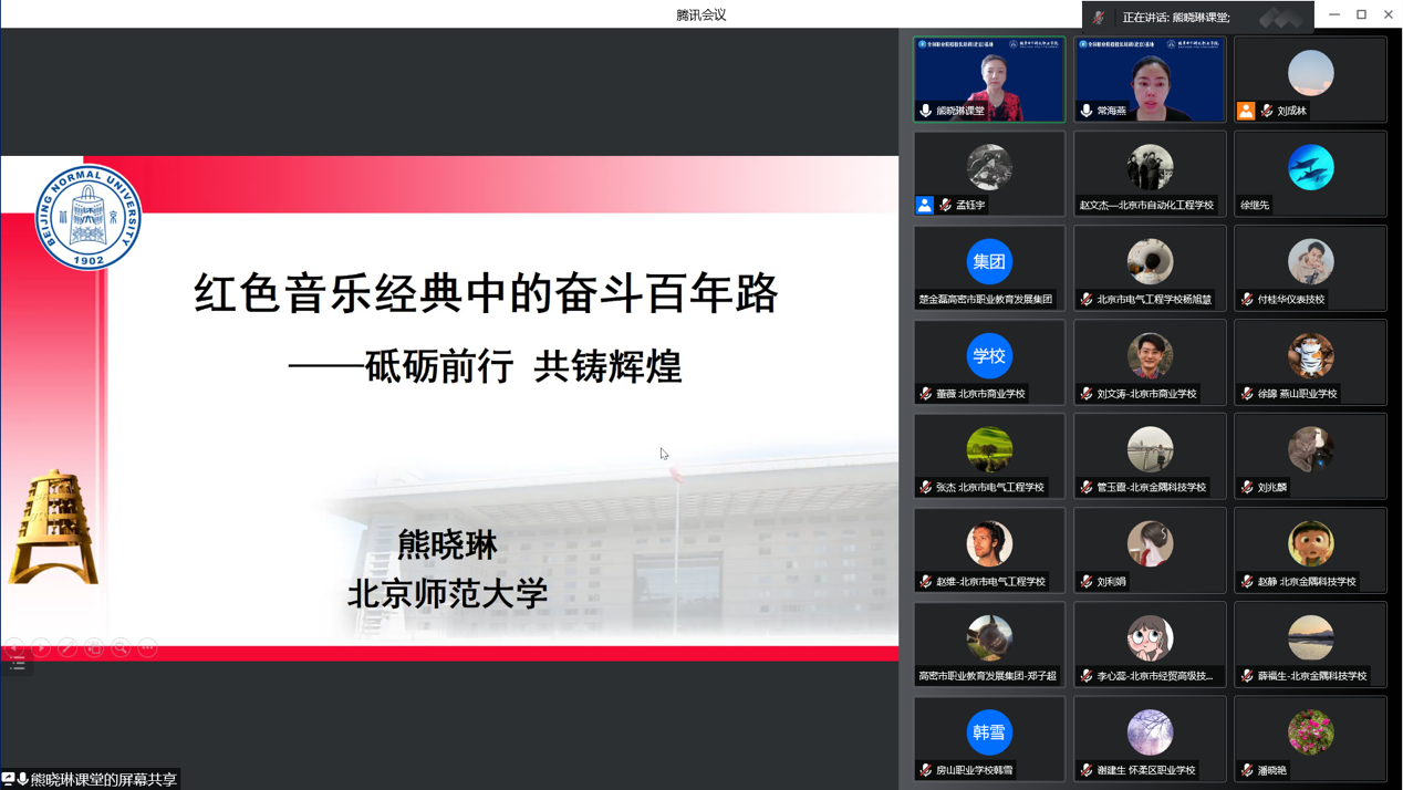 北京师范大学马克思主义学院教授、博士生导师熊晓琳教授作了《红色音乐经典中的奋斗百年路——砥砺前行 共铸辉煌》的讲座。以党的百年奋斗四个历史时期为主线,讲述了“抗美援朝,保家卫国”“筚路蓝缕,艰苦创业”“改革春风,继往开来”“风雨兼程,走向复兴”四个部分内容。从“雄赳赳、气昂昂,跨过鸭绿江”的《中国人民志愿军战歌》《我的祖国》《歌唱祖国》《我为祖国献石油》《小路》到《春天的故事》《东方之珠》《七子之歌》再到《北京欢迎你》《祖国不会忘记》《强军战歌》,每一首歌都是一段奋斗的历史。熊教授以史串歌、以歌叙史,在每一个历史节点,都巧妙选取了极为贴切的红色经典音乐,结合讲述音乐作品创作背景,带领参培学员回顾了中国共产党人的艰苦奋斗历程和恢弘历史成就,点燃了学员们的爱国之情,提升了学员们的民族自豪感和使命感,受到学员们的一致好评。
