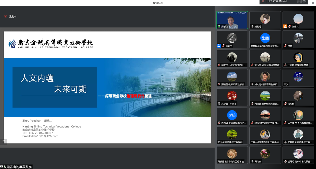 南京金陵高等职业技术学校校长,南京师范大学教育科学学院硕士生导师周乐山教授作了《人文内蕴,未来可期——探寻职业学校治理现代化肌理》的讲座。周教授以本校教育教学改革实践的真实案例为学员们讲解了创建人文校园的构想,并从人文环境的重构和治理结构的转型两个方面详细阐述了改革的具体做法及取得的丰硕成果。他指出,要“以学生为本,面向未来”,培养学生互联网思维以适应未来工作和生活;学校管理要在教师、课程、治理结构的传统模式基础上增加教育创新、学生个性化成长生态和学生支持生态,形成家校合力,点燃学生的学习热情,为学生的终身学习服务,做社会文明和社会准则的传承者和接班人。周教授通过本校大量真实的教育教学改革实践案例的讲解,使参培学员们深受启发。