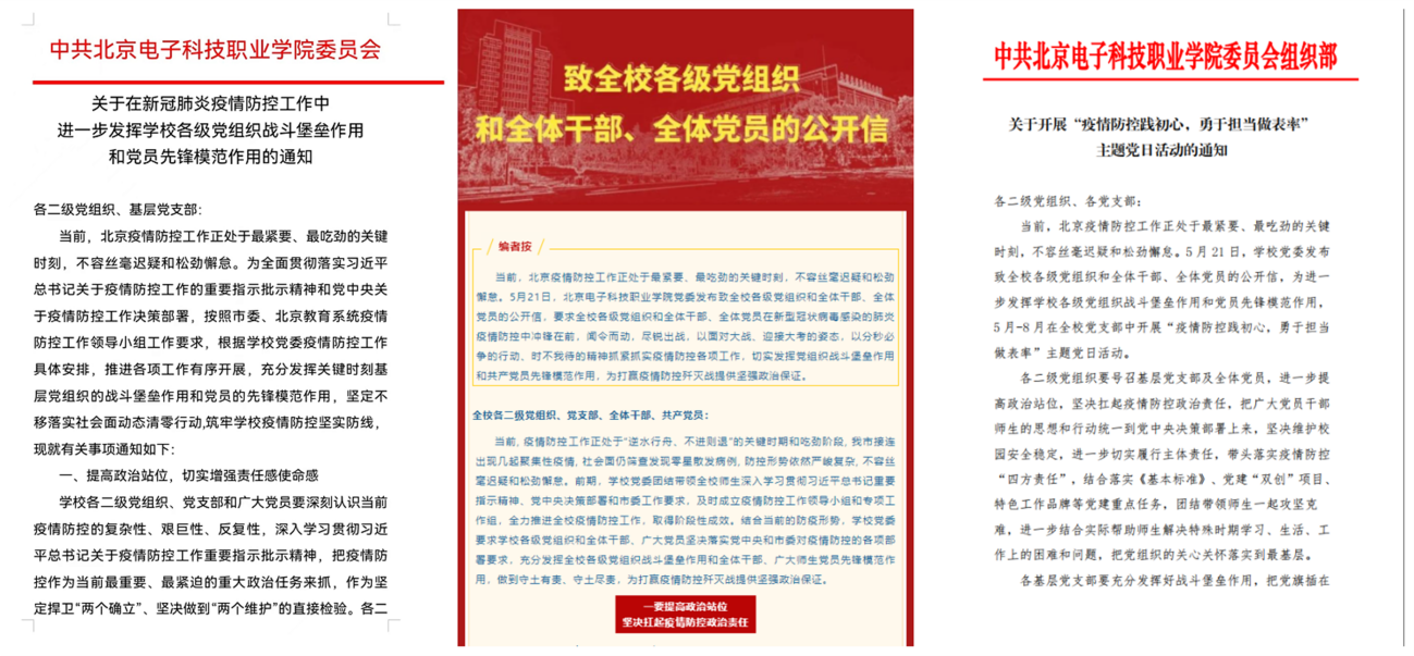 在疫情防控的关键时期,北京电子科技职业学院党委坚决贯彻习近平总书记对疫情防控工作的重要讲话和指示精神,把疫情防控工作作为学校最重要的工作来抓,严格落实防控工作主体责任,坚持党建引领,充分发挥基层党组织战斗堡垒作用和党员先锋模范作用,以冲在最前沿、守在第一线的实际行动践行初心使命,同心抗疫、同力克艰,坚定打赢疫情防控歼灭战的必胜信心,将党旗牢牢插到防疫第一线。