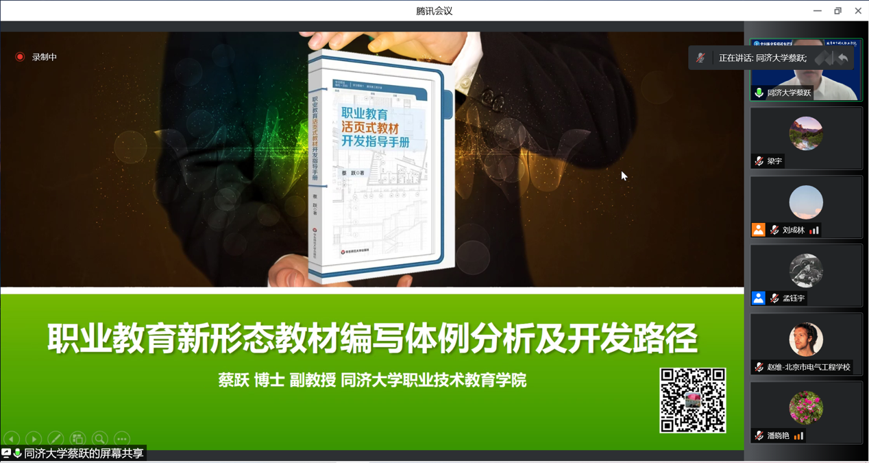 同济大学职业技术教育学院副教授、培训部主任、硕士生导师蔡跃作了题为《职业教育新形态教材编写体例分析及开发路径》的报告。从职业教育教材的重要性、教材的政策分析、教材编写体例及样例分析、对比德国职业教育进行教材编写体例、样例分析以及教材开发存在的问题以及活页式教材开发方法的方法进行了介绍,特别针对职业教育深耕细作的专门化深度和高度,为学员打开了活页式教材编写的方法和路径。
