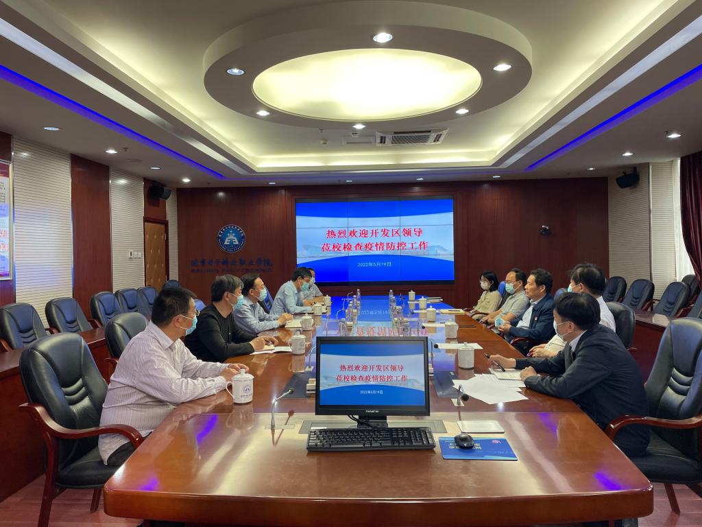 2022年5月19日,开发区工委委员、派驻纪检监察组组长吕新利一行5人入校检查疫情防控工作。院长姚光业、副院长朱运利代表学校接待来访人员并陪同检查。