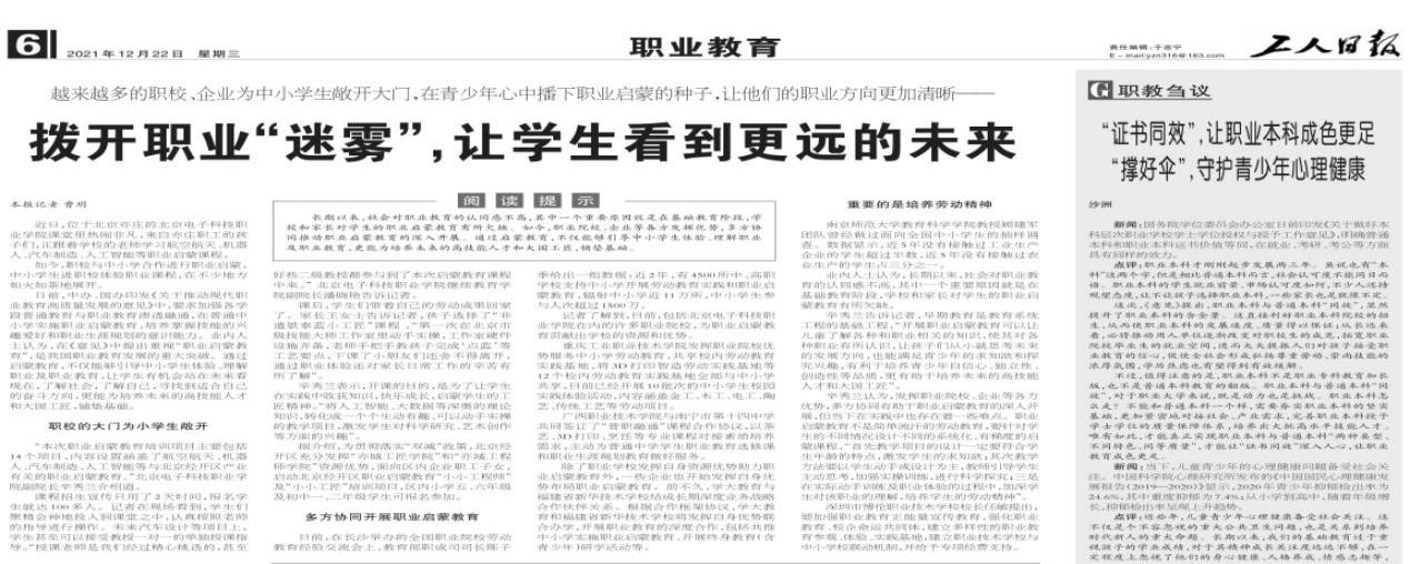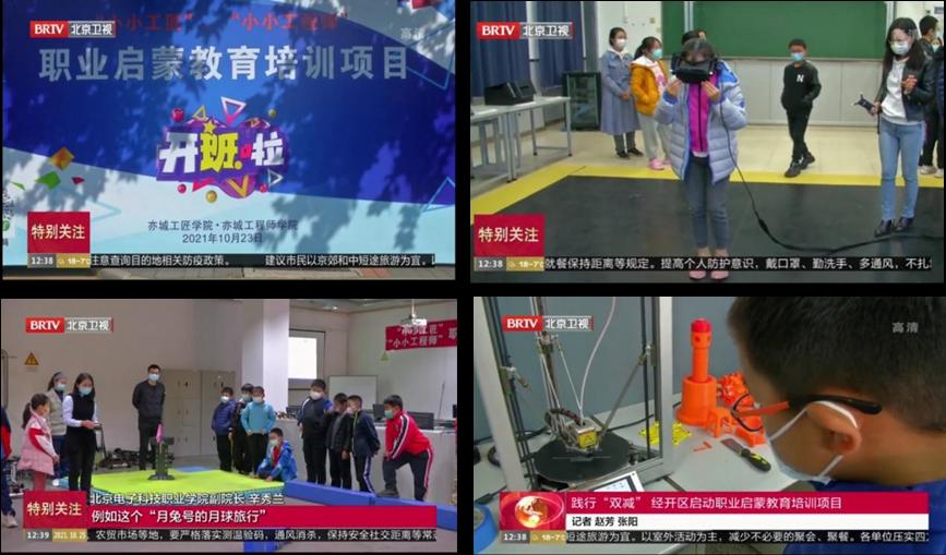 开放共享,开展多样化职业启蒙教育。为贯彻落实《国家职业教育改革实施方案》、加强职业教育与普通教育各学段的渗透融通,培养中小学生掌握技能的兴趣爱好和职业生涯规划的意识能力,弘扬劳动精神和工匠精神,助力职业教育体系向下延伸,实现普通教育与职业教育的融合贯通,为培养更多高素质技能人才、能工巧匠、大国工匠打下基础,学校开展了小学生课后一小时实践活动、初中开放性科学实践活动、“小小工匠” “小小工程师”职业启蒙教育等中小学生职业启蒙教育,设计了玉兔号月球旅行、设计未来汽车、动感电车梦工场、人工智能小汽车设计制作等近20个与经开区产业密切相关的职业启蒙课程。三年来共开展初中开放性科学实践活动5期,累计1425人次;学校开展小学生课后一小时实践活动3期,累计268人次;开展“小小工匠” “小小工程师”职业启蒙教育培训1期,累计164人次。多样化的启蒙课程受到了学生们的欢迎,北京卫视等多家媒体对此进行了报道。