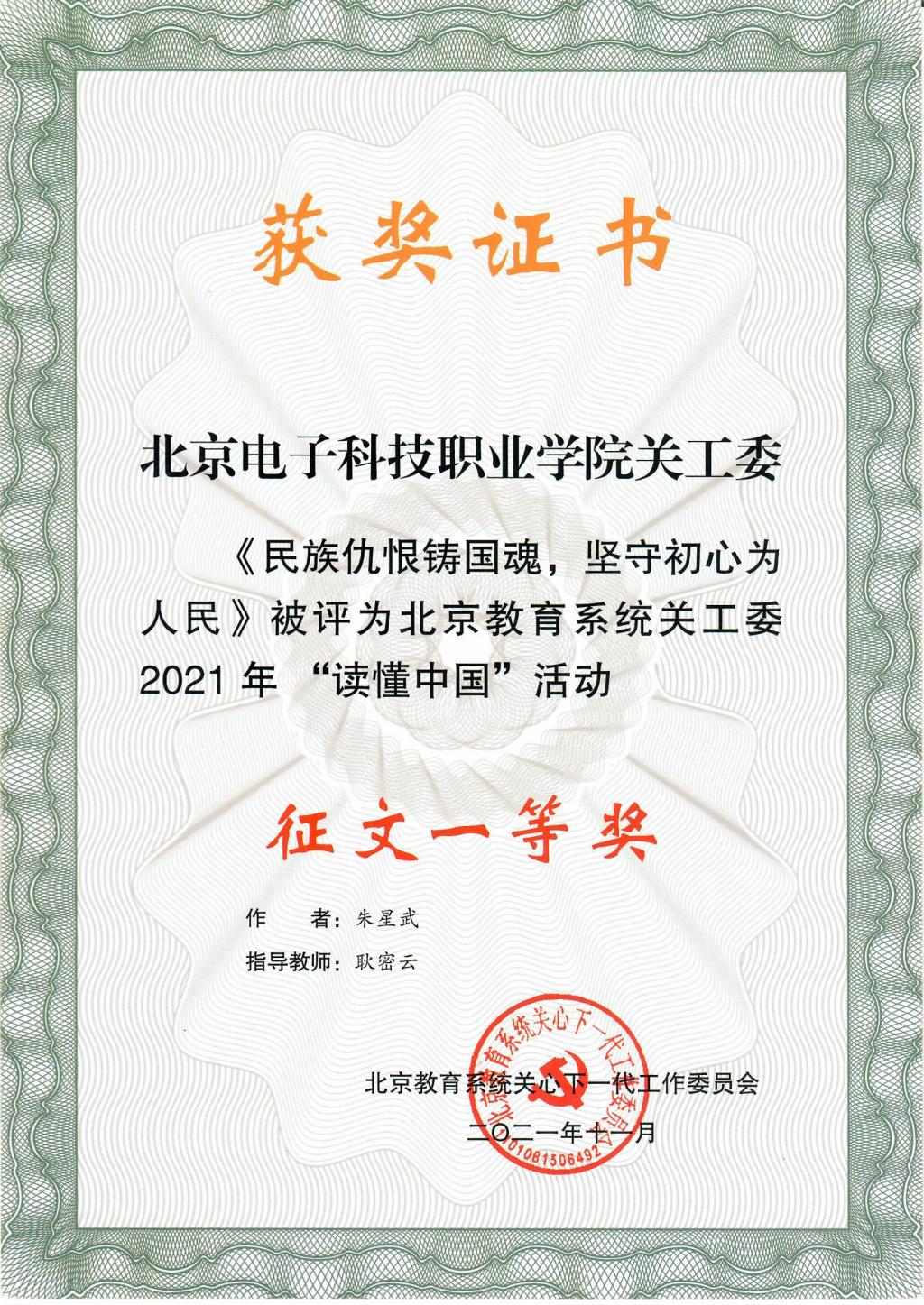 学校关工委在荣获教育部先进集体的基础上,又荣获北京教育系统关工委2021年信息宣传工作先进单位、北京教育系统关工委2021年“新时代好少年”主题教育读书活动先进集体、北京教育系统关工委2021年“读懂中国”优秀组织奖。《薪火相传 初心永恒》微视频荣获北京教育系统关工委2021年“读懂中国”微视频一等奖、高职学生朱星武《民族仇恨铸国魂 坚守初心为人民》等五篇征文分获北京教育系统关工委2021年“读懂中国”主题征文一等奖1个,二等奖3个,三等奖1个。离退休工作处处长、党委组织部副部长、关工委秘书长陈晓文荣获北京教育系统关工委2021年信息宣传工作先进个人荣誉称号。