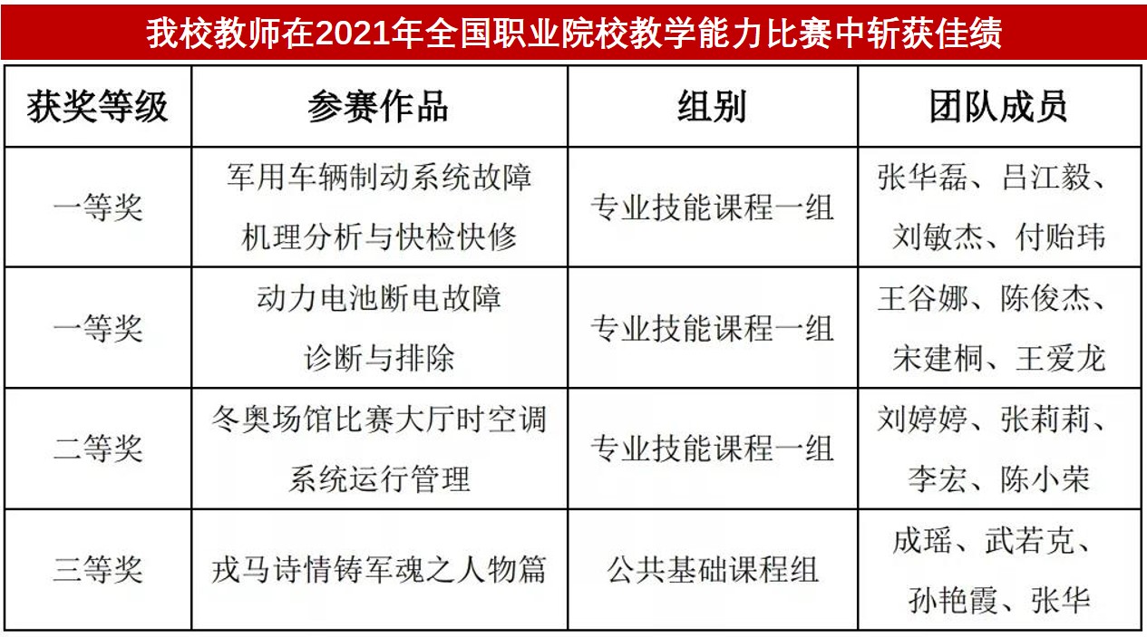 2021年,学校充分发挥教育评价的指挥棒作用,引导确立科学的育人目标,确保教育正确发展方向。6月15日,学校召开考核与专业技术职务评聘改革工作部署会,启动修订教职工考核管理办法及专业技术职务评聘等文件。11月12日,学校召开四届四次教职工代表大会,审议通过了《教职工考核管理办法》《专业技术职务评聘管理办法》《科研成果和科研活动认定与量化办法(试行稿)》。学校党委高度重视教师队伍建设,配齐配强教师工作部力量,成立教师发展中心,整合教师培养培育资源,多举措建设高素质双师型队伍。学校教师在全国职业院校教学能力比赛获一等奖两项、二等奖一项、三等奖一项,获奖总数位居全国第一。两名教师分别获得北京高校青年教师基本功比赛一等奖和二等奖,学校连续六届均获得一等奖。