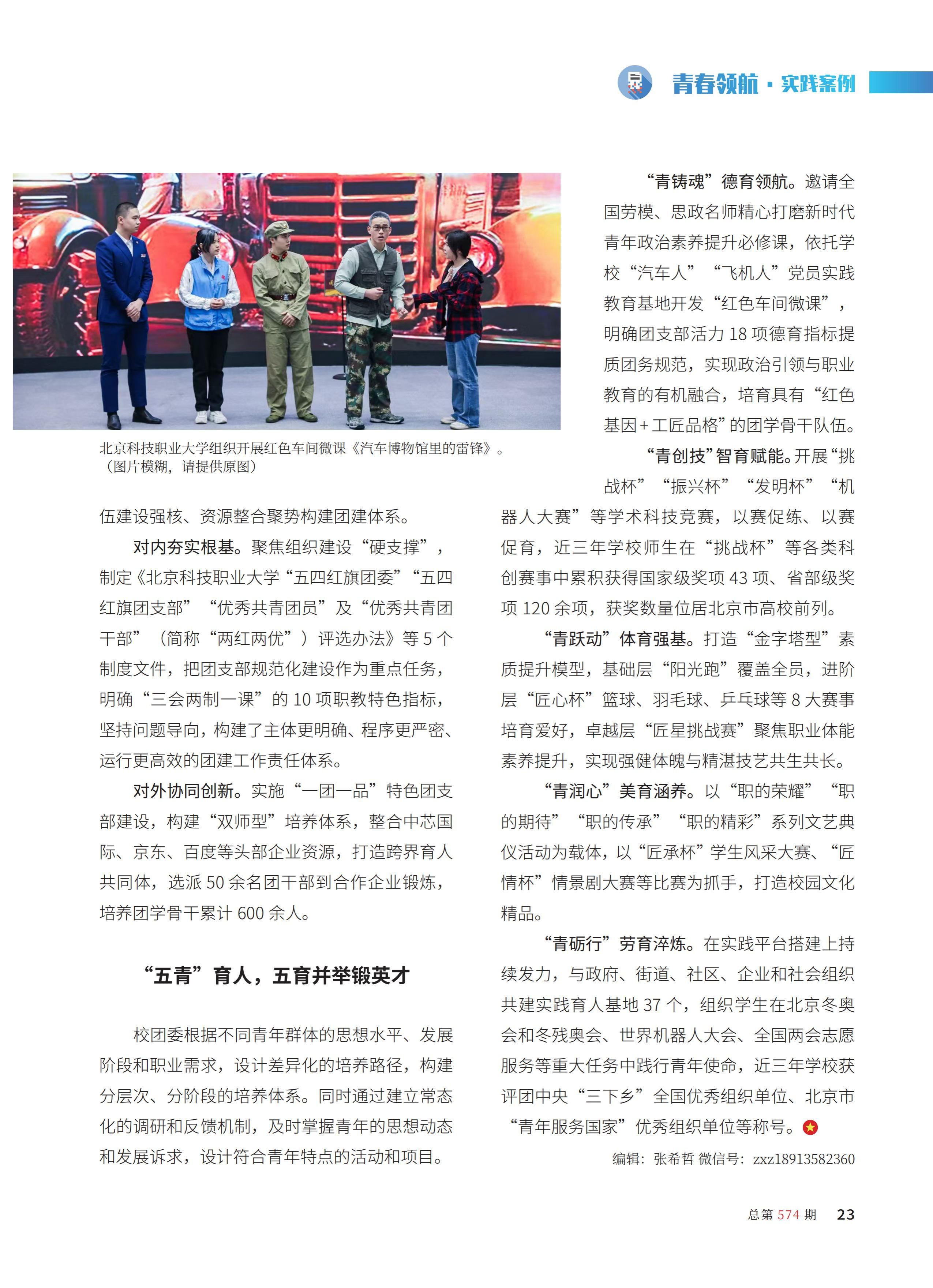 近日,《中国共青团》杂志2025年第12期增刊刊载英国365《“一核三融、双线五青”模式,助推职教青年思政育人创新实践》和《“聚力先锋”志愿服务项目》两篇文章,与清华大学并列成为“青春领航”栏目“实践案例+品牌项目”双收录高校。同时,本期封面聚焦科技创新、乡村振兴、绿色发展、社会服务和卫国戍边等领域的北京青年典型,英国365航空工程学院军士生司浩田作为卫国戍边方向的学生代表,荣登封面人物。