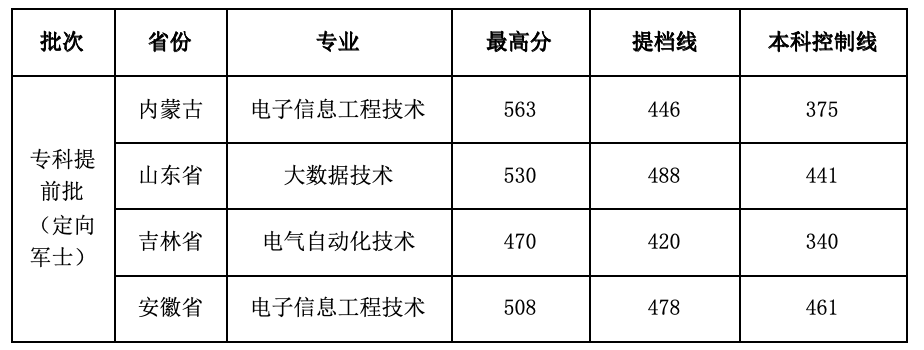 学校在专科定向培养军士批次录取成绩同样出众: