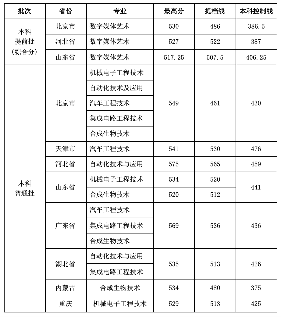 学校2025年首批共设置机械电子工程技术、自动化技术与应用、汽车工程技术、集成电路工程技术、合成生物技术、数字媒体艺术等6个本科招生专业,总计划600人,其中京内540人,京外在天津、河北、山东、山西、湖北、广东、重庆、内蒙古等省(自治区、直辖市)共招生60人。截至7月22日,已完成录取工作的省份和批次为: