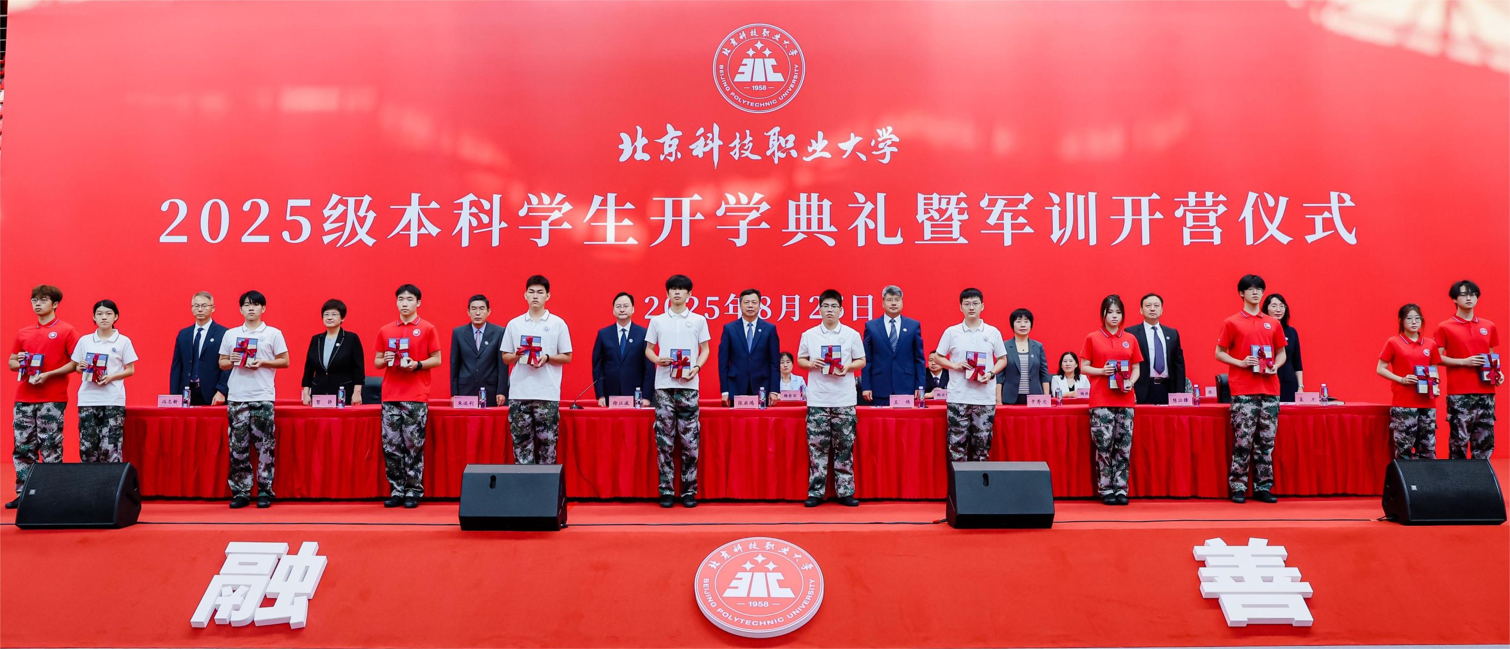 学校领导亲切地为2025级新生代表佩戴北职大校徽,并赠送寓意书山有径、饱含成长期待的书籍。全体本科学生胸前闪耀的徽章,不仅凝聚着学校“精融善新”的校训真谛,更承载着“求实、创新、厚德、重艺”的校风传承。