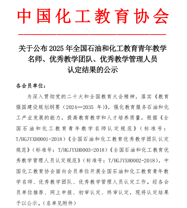 此次认定工作是中国化工教育协会为深入贯彻党的二十大和全国教育大会精神,全面落实《教育强国建设规划纲要(2024—2035年)》战略部署而组织的重要活动。旨在强化教育服务石油和化工产业发展的能力,切实提升教育教学和人才培养的质量与适配度。整个认定过程严格规范,经过各会员单位择优推荐、材料网上申报、专家初审、权威终审等多重环节,最终遴选出代表国内石油化工教育领域高水平、有担当的先进典型。这三项荣誉的取得,是学院全国党建标杆院系、国家级教学创新团队和全国高校黄大年团队建设的重要成果,也是综合办学实力和师资队伍建设的一次集中展示,为学校赢得了广泛的社会声誉。