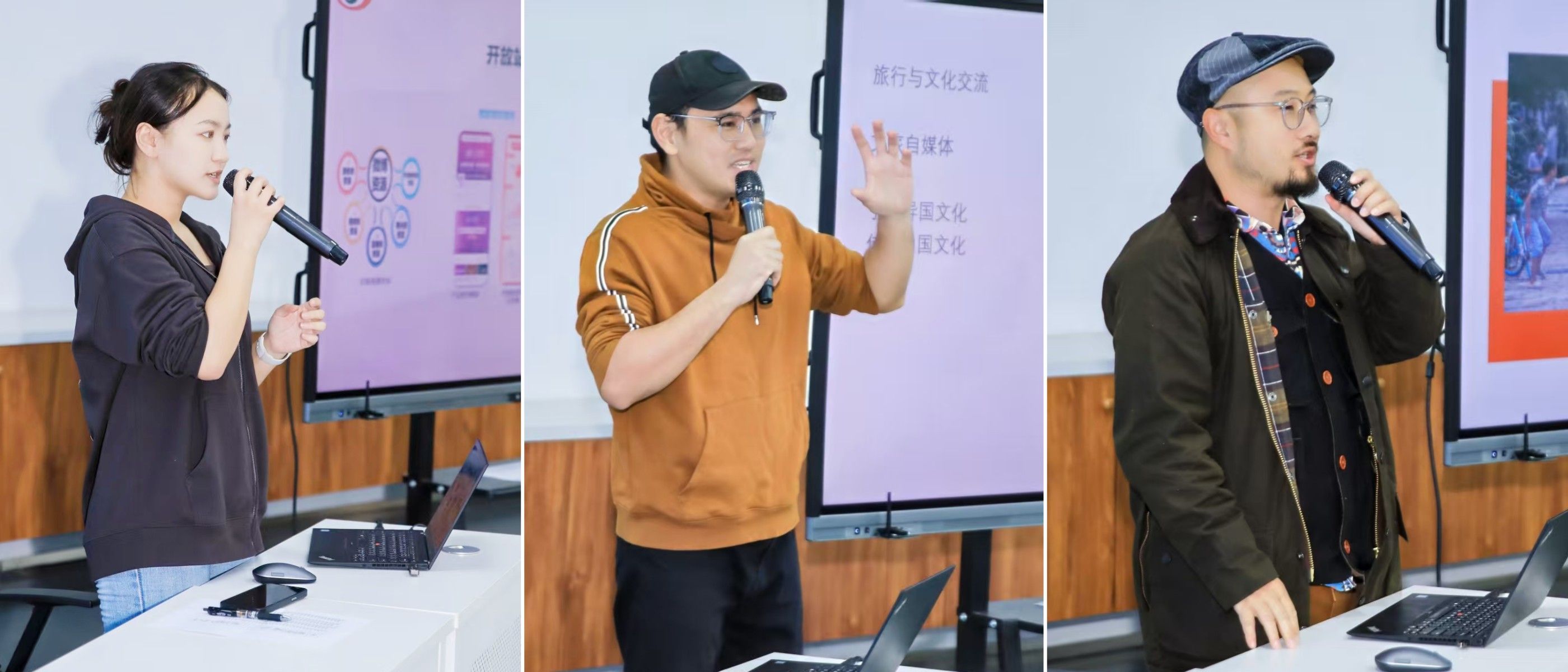 在随后的座谈会上,与会嘉宾围绕新媒体内容创作、个人职业成长等话题与青年学生代表展开深入交流。新浪微博年轻用户发展部渠道经理杜成竹以“微博校园内容创作”为主题,从平台机制与产品功能入手,深入解读了微博的热搜机制和校园系列产品的运营策略,帮助同学们对微博的内容生态和运营逻辑形成更系统、更深入的认知。旅行自媒体人、环球旅行达人哈先生Harry结合自身实践经历,分享了新媒体创作的心得与感悟。他强调“热爱”是持续创作的动力源泉,并鼓励青年学子勇于探索、坚持表达,用内容传递文化的魅力。作为《中国国家旅游》特约撰稿人及纪录片导演的大鼓楼老师以“换个角度看世界”为题,分享了如何通过镜头与文字,将故事讲述得既有深度又有温度。鼓励大家保持对生活的好奇心、对创作的热情,避免陷入“信息茧房”的局限。