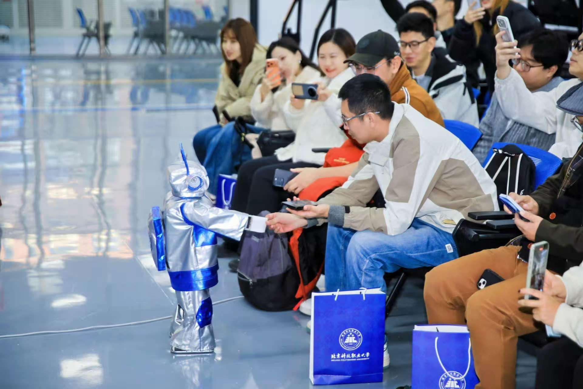 活动现场,机电工程学院机器人创新应用社团的同学们展示了他们自主研发的机器人“0306小巨人”,机器人萌态可掬的舞姿和精准有力的敬礼,引得现场嘉宾和同学们阵阵欢笑与掌声。