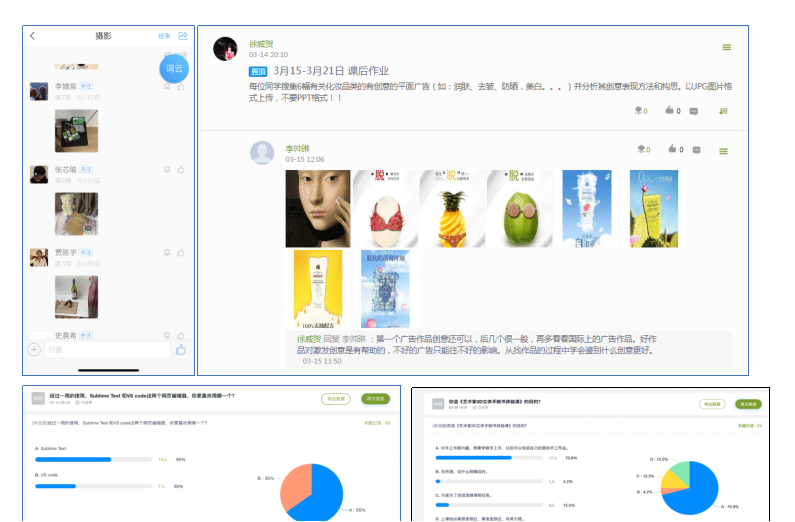 为了确保学生的线上学习质量,班主任、辅导员老师们做了大量的工作,通过召开班委会、班会的方式进行了学生的网络学习情况调查,并针对具体困难给予合理解决。 老师们采用了各种各样的的教学手段,设置了大量的教学活动:主题讨论、单个提问、分组任务、章节测验、调查问卷、投票问答、快速抢答、随堂练习、翻转课堂……师生互动没有课上课下的界限、主题讨论没有题外题内的束缚,灵活机动的手段都是为了有效地调动起学生学习的自觉性,如何通过线上线下教育的结合来让每一个学习者获得最大限度的提升,更好地利用“新技术”达成育人目标,值得教师们继续去实践和探索。