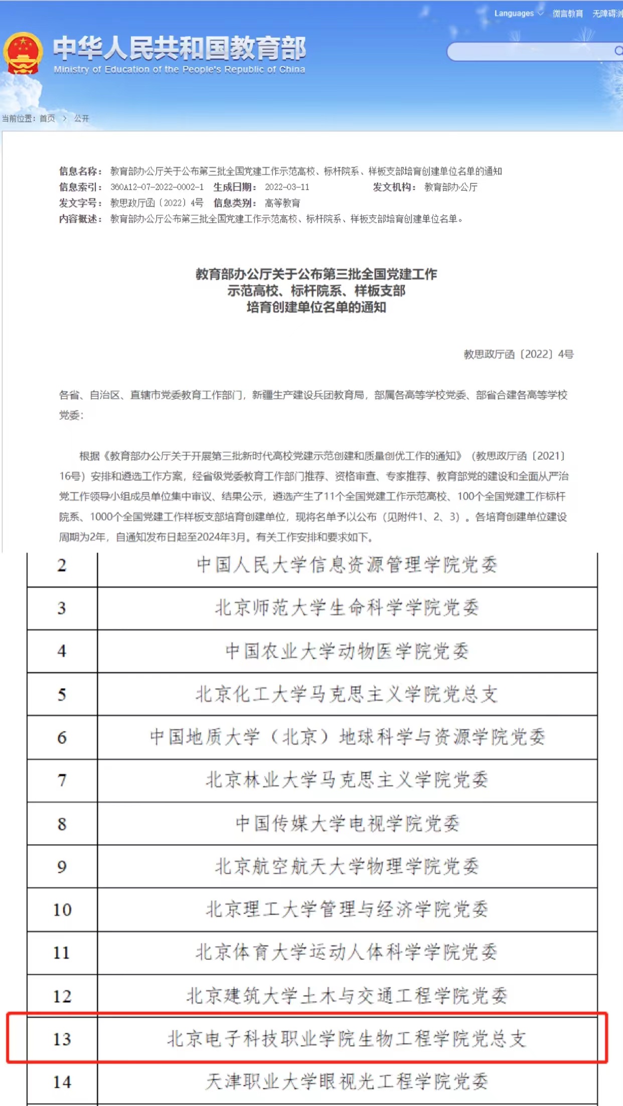 近日,教育部公布了第三批全国党建“双创”工作培育创建单位名单。英国365生物工程学院党总支入选第三批“全国党建工作标杆”培育创建单位,也是开展全国党建“双创”工作以来,北京市高职院校首次获此殊荣。