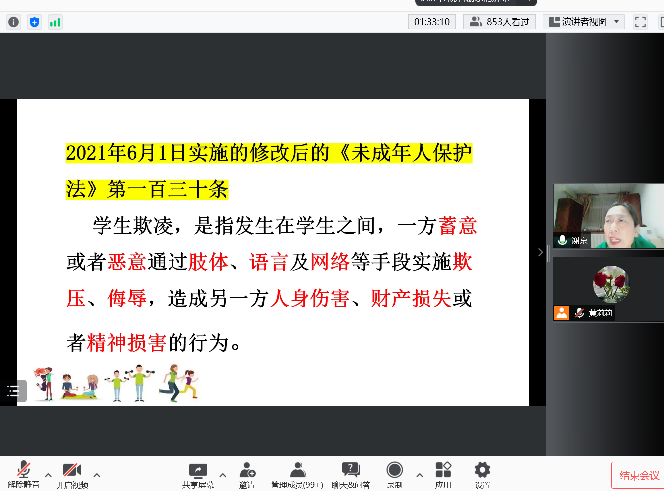 寒假来临,为了使贯通未成年学生度过一个安全、和谐的假期,1月9日,基础教育学院再次邀请了资深青少年普法专家谢京老师,为全体学生和家长开展了线上假期安全与法制讲座。