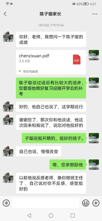 网课期间,赵老师保持每周与每位同学谈心谈话,了解学生的情况,拉近了与学生之间的距离,建立了良好的师生关系,走进了学生的内心,更好地去引导他们明确学习的方向与目标,建立了良好的班级学习风气。