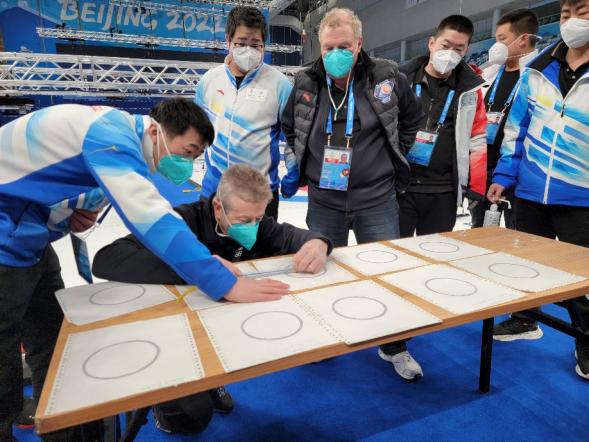 学生在双冰场馆在国际制冰师的指导下为冬奥会制冰