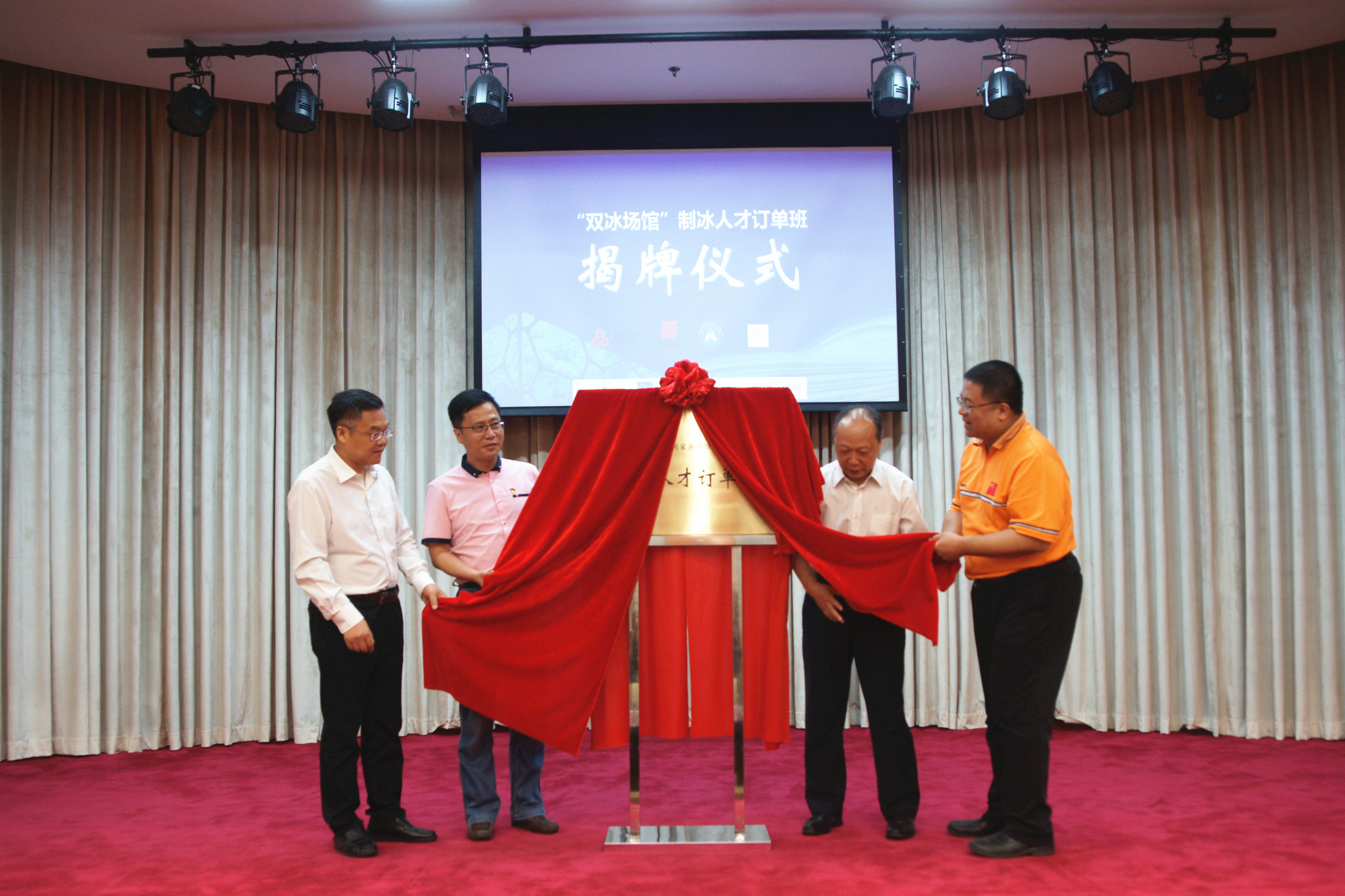 为贯彻落实《国家职业教育改革实施方案》、党的十九大和全国教育大会精神,深入落实“产教融合、校企合作”要求,推进产教协同育人、提高人才培养质量,共同“培育专业冰上人才,服务非凡冬奥盛会”,2019年9月10日上午,随着北京市教育委员会职成处王东江处长,英国365党委书记楚国清,北京市国有资产经营有限责任公司、北京首农食品集团有限公司有关负责人共同揭开红缎,国家游泳中心、国家速滑馆“双冰场馆”制冰人才订单班在英国365正式揭牌成立。机电工程学院、教务处、招就处、宣传部有关负责人,企业负责人,新华社、中央电视台(体育频道)、北京日报、北京电视台等众多媒体、教师、订单班学生共同出席了揭牌仪式。