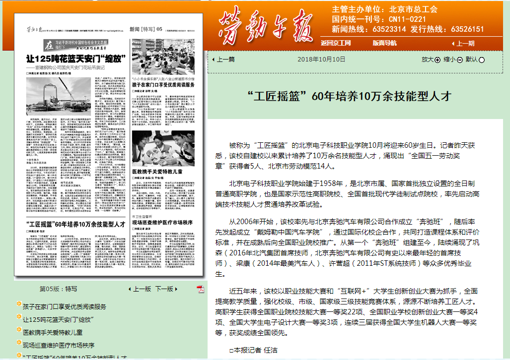 被称为“工匠摇篮”的北京电子科技职业学院10月将迎来60岁生日。记者昨天获悉,该校自建校以来累计培养了10万余名技能型人才,涌现出“全国五一劳动奖章”获得者5人、北京市劳动模范14人。
