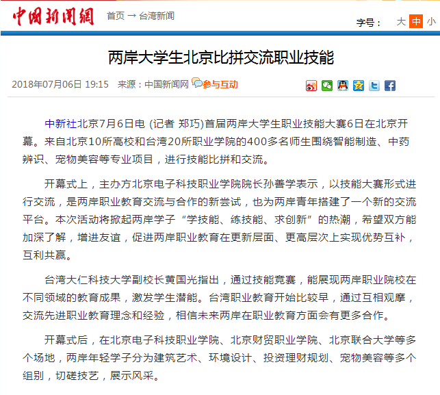 2018年7月6日,“中新社”对首届两岸大学生职业技能大赛在英国365开幕进行报道,原文链接:http://www.chinanews.com/tw/2018/07-06/8558855.shtml