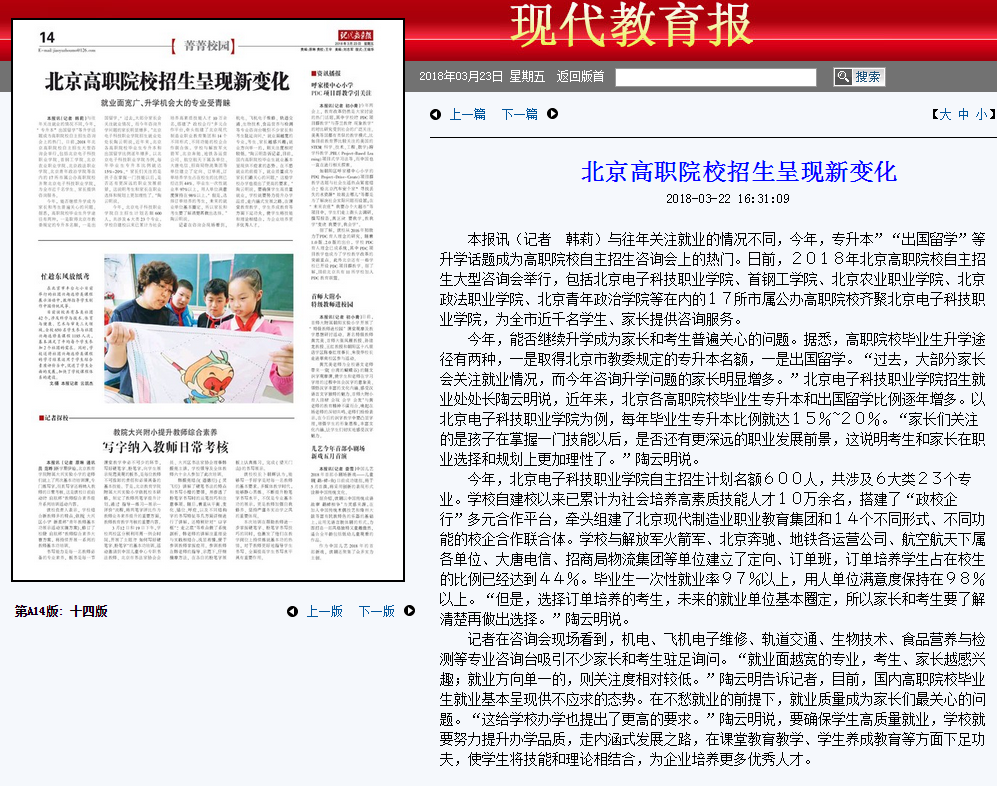 今年,北京电子科技职业学院自主招生计划名额600人,共涉及6大类23个专业。学校自建校以来已累计为社会培养高素质技能人才10万余名,搭建了“政校企行”多元合作平台,牵头组建了北京现代制造业职业教育集团和14个不同形式、不同功能的校企合作联合体。学校与解放军火箭军、北京奔驰、地铁各运营公司、航空航天下属各单位、大唐电信、招商局物流集团等单位建立了定向、订单班,订单培养学生占在校生的比例已经达到44%。毕业生一次性就业率97%以上,用人单位满意度保持在98%以上。“但是,选择订单培养的考生,未来的就业单位基本圈定,所以家长和考生要了解清楚再做出选择。”陶云明说。