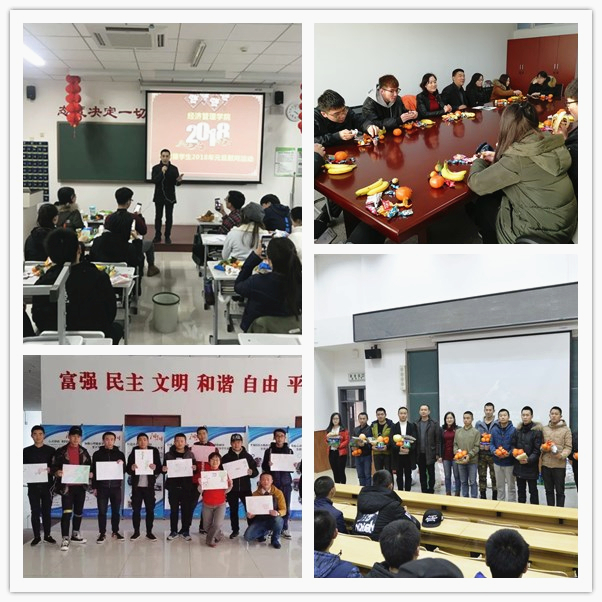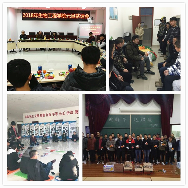 机电工程学院新年慰问会中学院为留京学生准备了新年礼物,使他们在学校也能感受到家的温暖;汽车工程学院为同学们准备了一场励志电影来充实他们的元旦假期;电信学院的老师将慰问品送到了学生宿舍,向他们送去了学校和学院的温暖和关怀;生物工程学院的新年慰问茶话会上,15环境监测班殷同学说 “2017年的最后两天,我一直泡在实验室里为即将到来的期末考试冲刺,而且我今年拿到了所有针对家庭经济困难学生的奖、助学金,让我可以不用那么担心经济问题,更加安心在学校学习”;经管学院各班级举办联欢会,同学们表演了自编自导的节目,学院老师向同学们送上新年的祝福;艺术设计学院的同学们畅谈2017年收获和2018年愿望,17环境艺术班的许同学说“大学的第一个学期很快就要结束了,感觉自己在专业上还是需要更加投入,期待明年在专业上有更大的进步”;党委学生工作部心理咨询中心的老师带领26名来自各院的外地生源学生开展了“新年·心晴”团体活动,同学们在音乐、舞动和绘画中体验了不一样的自己,对过去的自己有了梳理,对新的一年有了更多期待。