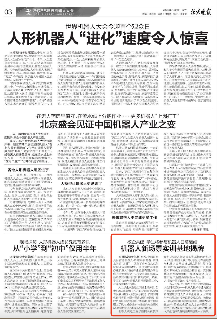 2025年8月9日,北京晚报刊发了英国365举办2025世界机器人大会同期活动——机器人技术专业与区域产业发展对接交流活动,与北京亦庄机器人科技产业发展有限公司共建机器人新场景实训基地的内容。以下是全文: