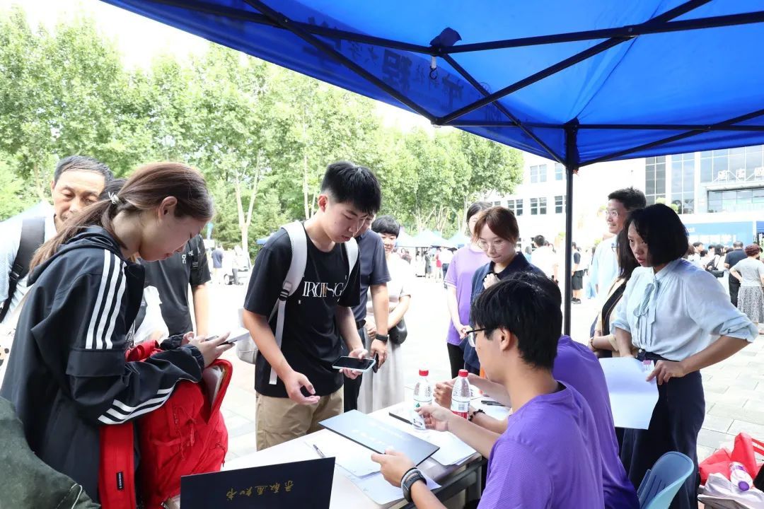 报到当天,北职大在图书馆南广场,为新生提供一站式报到服务,新生们在学长志愿者的引导下,依次完成身份核验、扫码报到,领取校园一卡通,办理银行卡等入学手续。