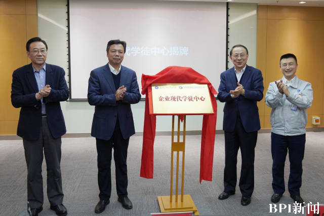 张启鸿、姚光业、谢小明、王海鹏共同为“企业现代学徒中心”揭牌。