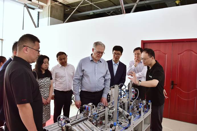 座谈会后,澳大利亚教育代表团一行参观了机电工程学院、智能网联汽车产业学院、艺术设计学院实习实训场地。