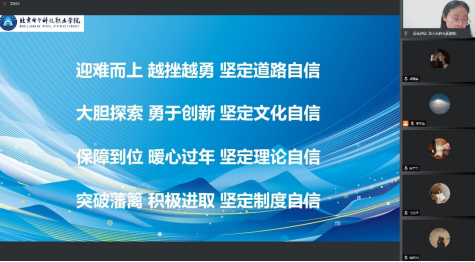 主讲人王晗璐老师是汽车工程学院辅导员、北京2022冬奥会住宿领域志愿者。她以“我和我的冬奥故事”为主题,分别从“迎难而上,越挫越勇,鉴定道路自信”、“突破藩篱,积极进取,坚定制度自信”、“保障到位,暖心过年,坚定理论自信”、“大胆探索,勇于创新,坚持文化自信”四方面分享了自己作为青年志愿者在服务冬奥会期间发生的点滴故事和收获感受。