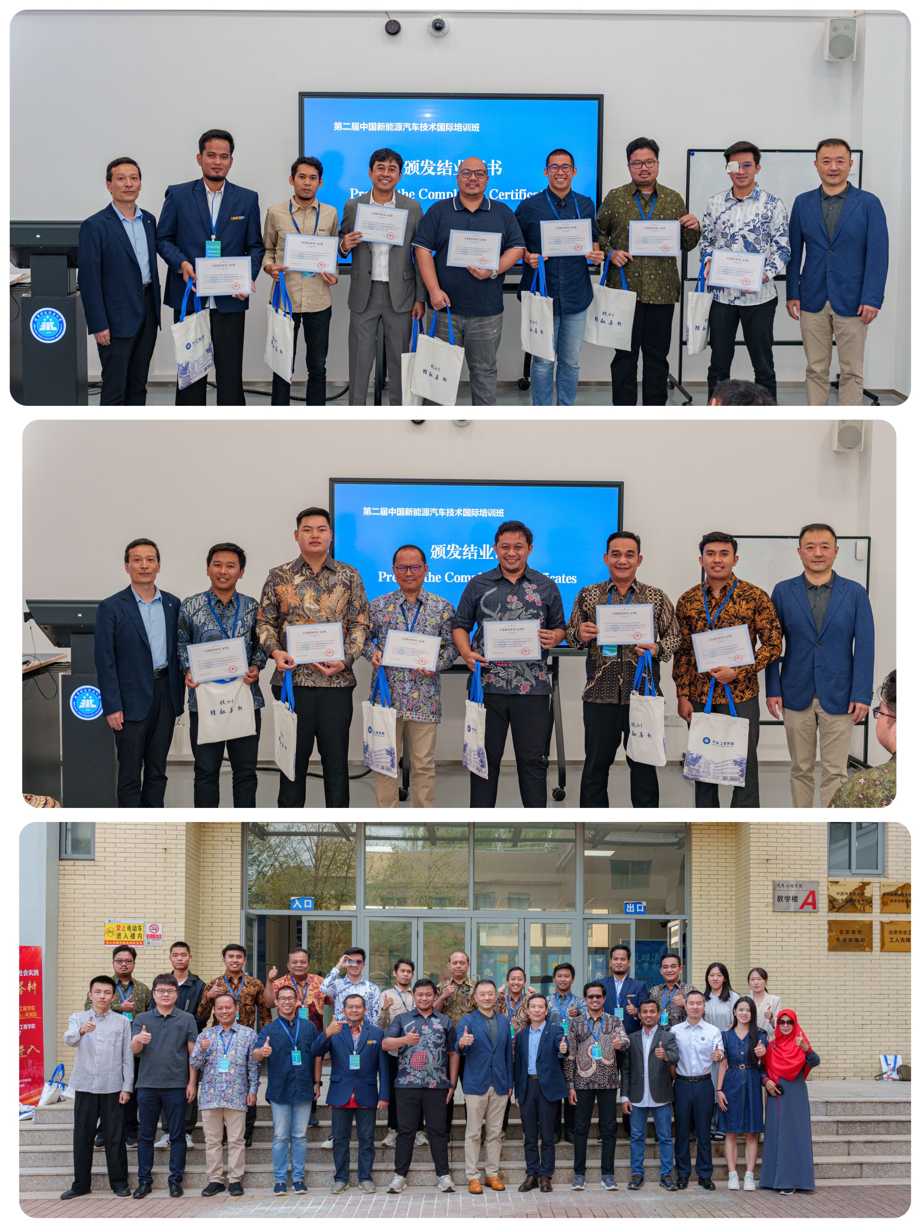 结业仪式上田雨时、朱青松分别为学员颁发结业证书及赠送纪念品。2025年正值中国与印尼建交75周年,此次国际培训班不仅是中印尼新能源汽车技术交流的盛会,更是两国深化职业教育合作、共促绿色产业发展的重要平台。未来,国创中心与北职大将持续深化合作,加快中国新能源汽车技术与职业教育经验“走出去”步伐,为全球绿色低碳转型贡献更多中国智慧、中国方案与中国力量。