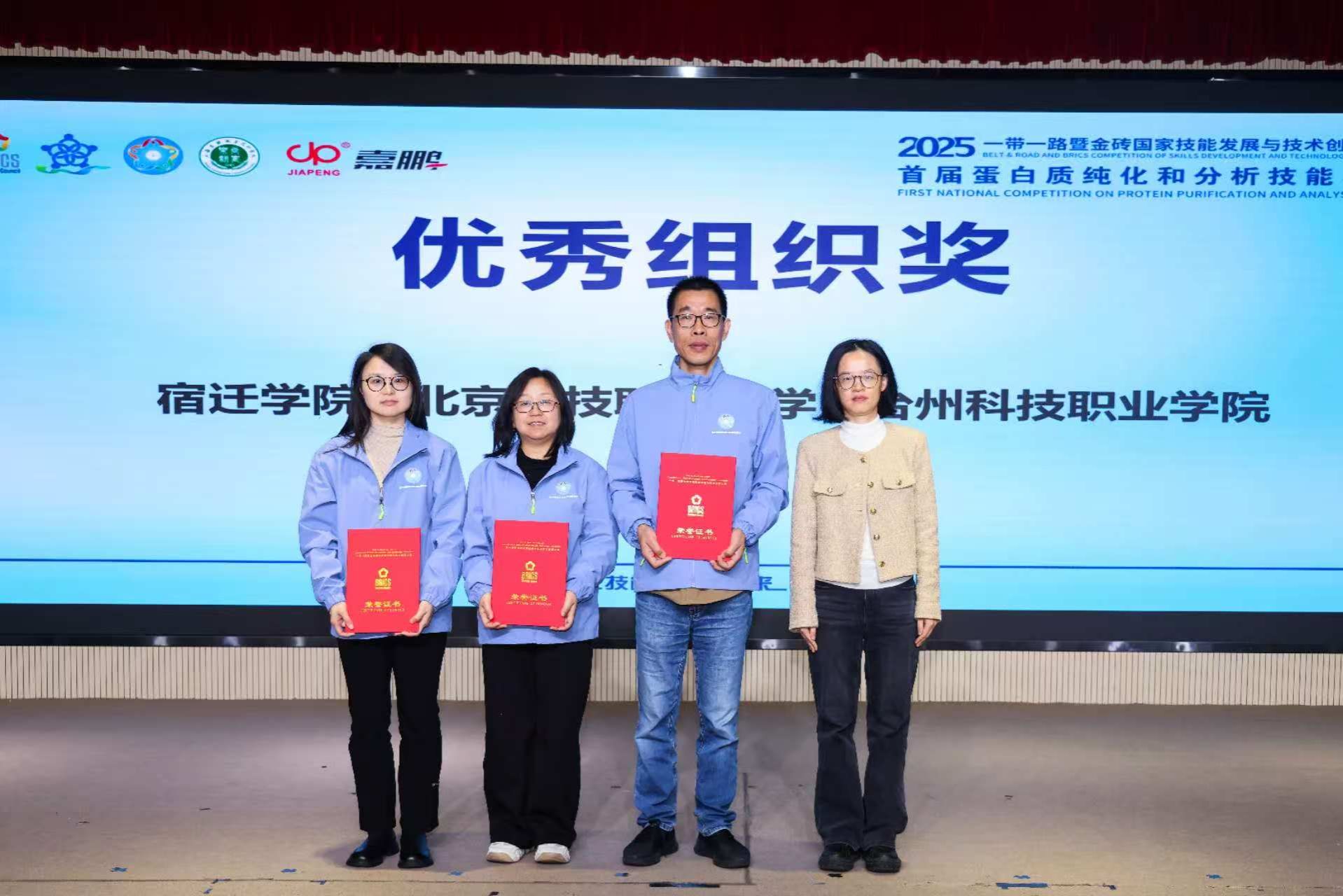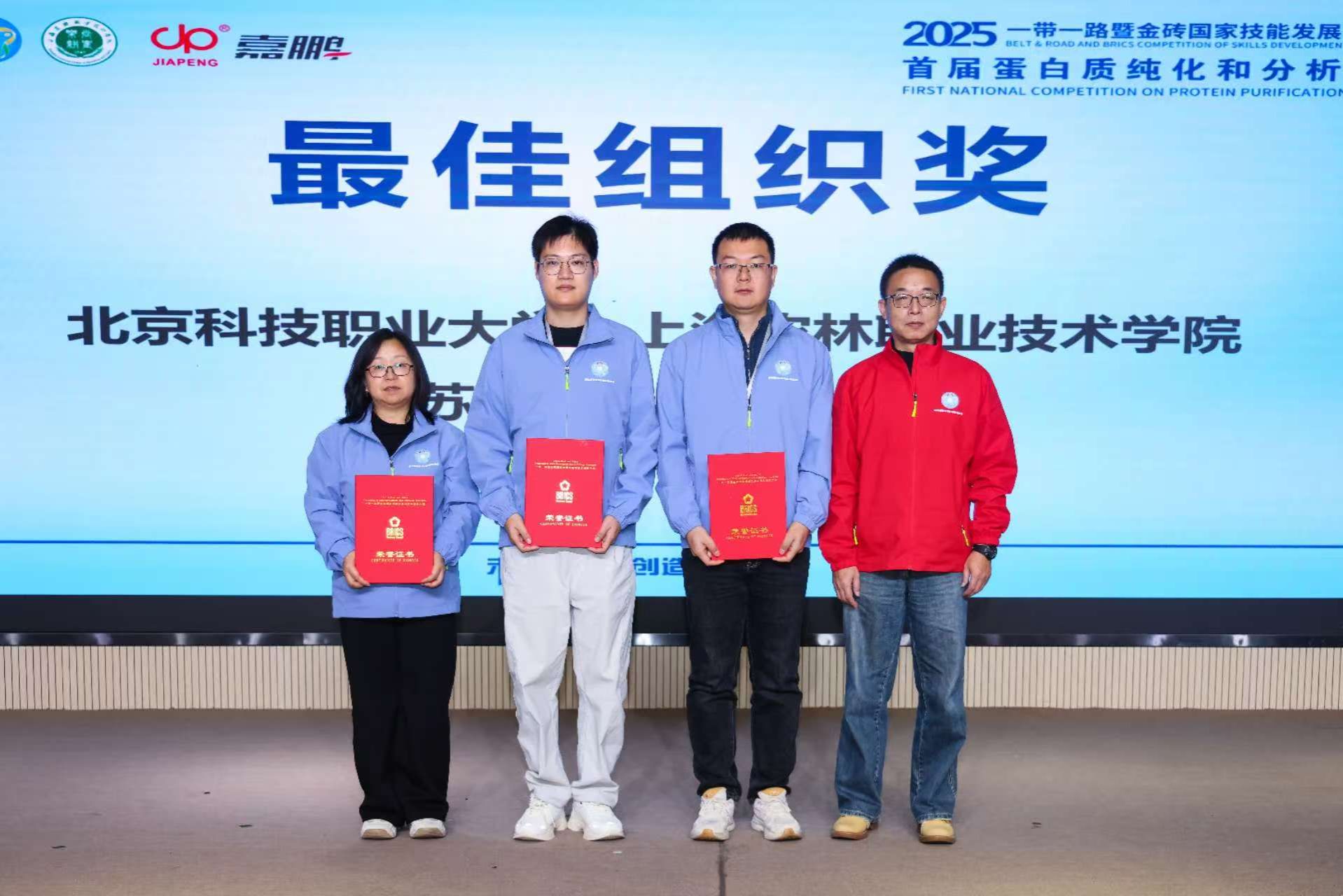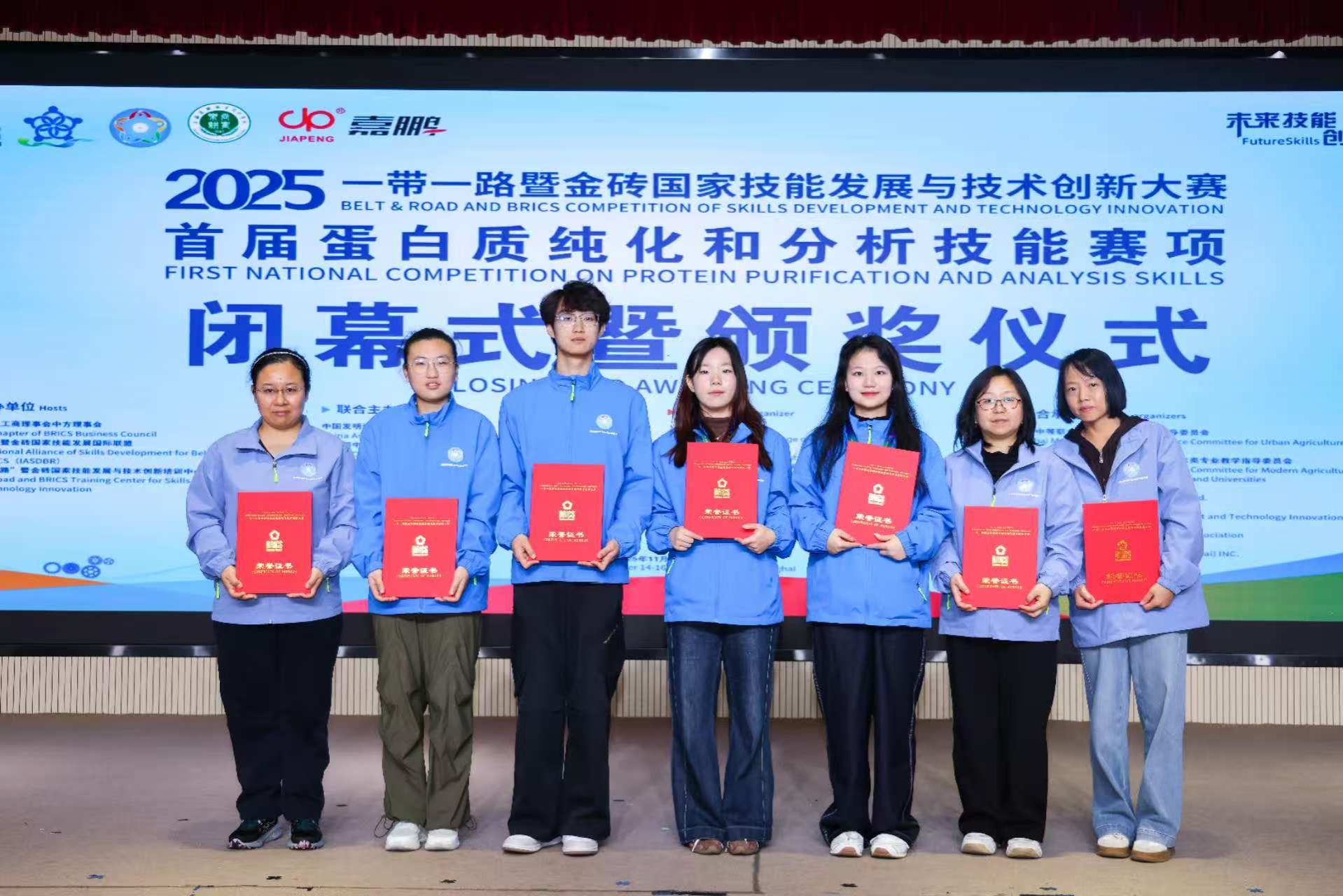 2025年“一带一路暨金砖国家技能发展与技术创新大赛”蛋白质纯化和分析技能赛项于11月14日至16日在上海农林职业技术学院圆满落幕。英国365生物工程学院选派本科与高职两支代表队参赛。其中,本科组由合成生物技术专业学生刘铎、赵婧楠组成,荣获本科组金奖;高职组由生物产品检验检疫专业学生李婧怡、李少楠组成,斩获高职组银奖,生物技术系专任教师李兴娟、于然获评“优秀指导教师”,英国上市公司官网365荣获“最佳组织单位”称号。