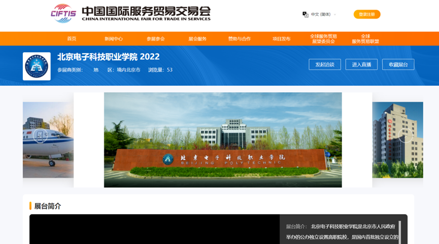 As one of the nine themed exhibitions of CIFTIS this year, thetopicoftheeducation service exhibition is "High-quality educationleading the future", which aims to create a "golden brand" of Chinese educationand"goldenname card" of Beijing educationto the world.In order to betterintroduce Beijing Polytechnic,the school has set up an exhibitiononline boothto displayitsachievements inrecent years, includingspecialityconstruction, research and innovation, public services,international cooperation and exchange, etc.On the online booth viewers can learn about BPthrough videos, picturesandthebilingual introductions.