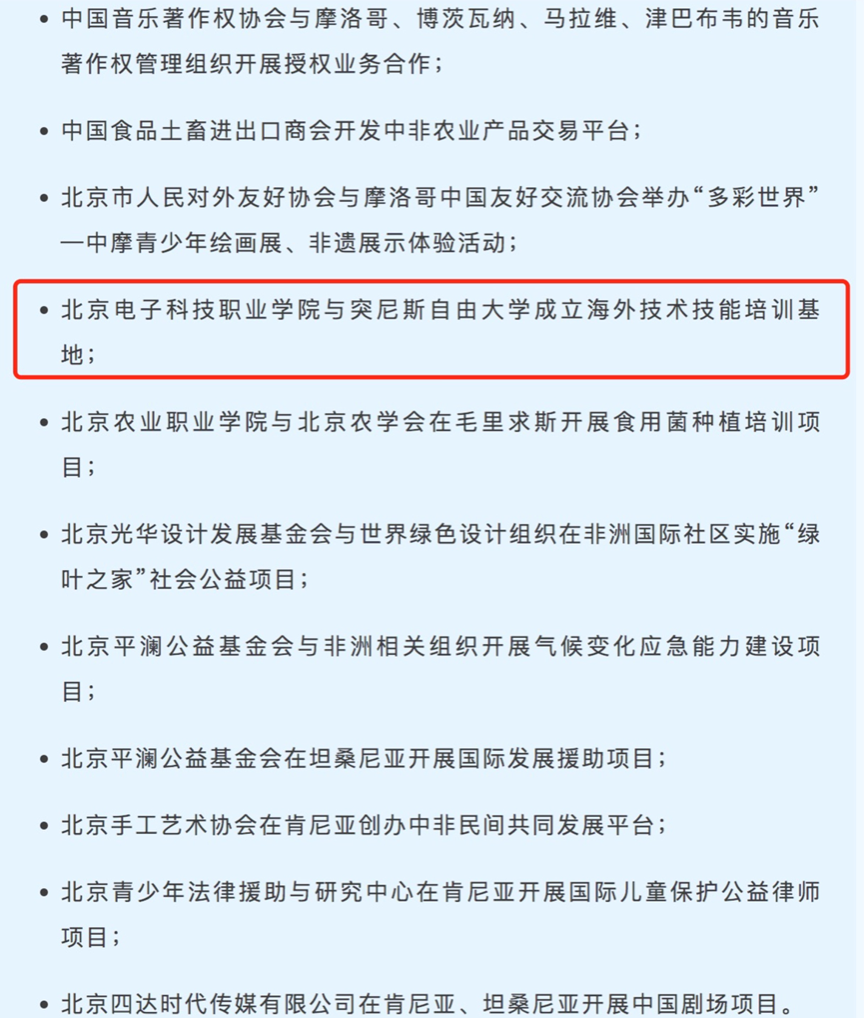 Eleven projects recommended by Beijing have been included in the outcome document, coming from two municipal - affiliated universities, two national industry associations and chambers of commerce decoupled in Beijing, one people's organization, five municipal - level social organizations, and one private enterprise. Ranking first in the country in terms of quantity, they actively contribute Beijing's private - sector strength to the building of a China - Africa community with a shared future.