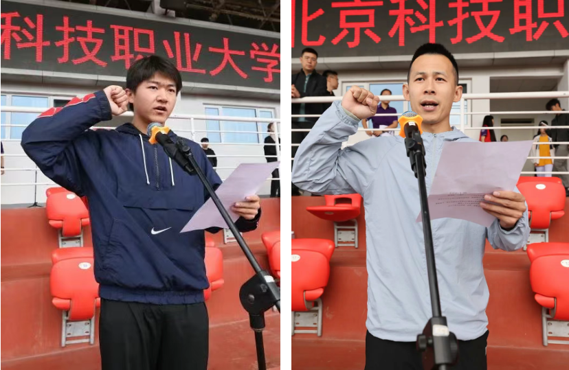 Zhang Xinrui, an athlete from the School of Aeronautical Engineering in the class of 2024, and Jiang Yueyuan, a teacher from the Physical Education Teaching Department of the School of Basic Education, took the oath on behalf of the athletes and referees respectively.